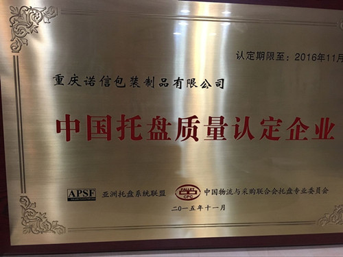 公司是中国商务部和国家标准委认定的”商贸物流标准化重点试点企业”,“中国标准托盘示范基地”、“中国托盘质量品牌企业”、“中国首批托盘质量认证企业”、“中国托盘企业30强”。是“中国绿色仓储与配送技术创新企业”、“中国城市物流技术与装备优秀供应商”、“重庆市重点笔电配套企业”、“国家鼓励类产业企业”。拥有EPAL生产和维修执照,是重庆市科委认定的知识产权信用单位、“重庆市中小企业技术研发中心”,拥有多项国家专利和高新技术产品,获得了IS09000、IS014001、OHSAS18001认证,拥有IPPC资质、林木加工、进出口全套资质认证等。